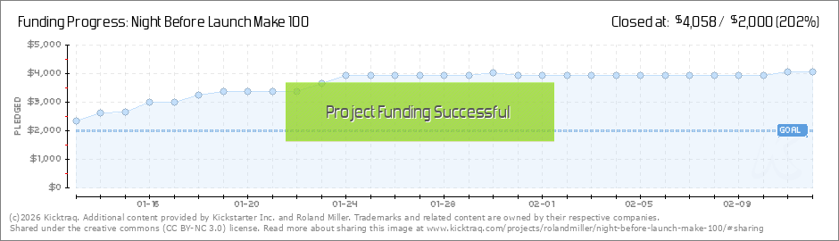 Thanks to everyone who has supported the Night Before Launch Make 100 campaign. We made our goal on the first day! There are plenty of rewards left, and at this rate they will likely go fast. Please spread the word to anyone you think would be... (Read More)