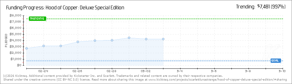 Help your backers reach your daily goals and help others see how you're doing. It's easy, with Kicktraq Mini.Here are a few quick snippits of code you can use to embed your personalized widget on your website, in your blog, and even on your favorite forum.