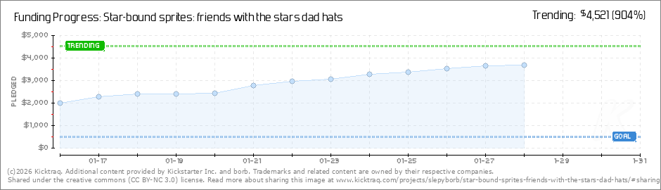Help your backers reach your daily goals and help others see how you're doing. It's easy, with Kicktraq Mini.Here are a few quick snippits of code you can use to embed your personalized widget on your website, in your blog, and even on your favorite forum.