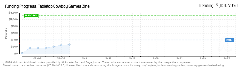 Help your backers reach your daily goals and help others see how you're doing. It's easy, with Kicktraq Mini.Here are a few quick snippits of code you can use to embed your personalized widget on your website, in your blog, and even on your favorite forum.