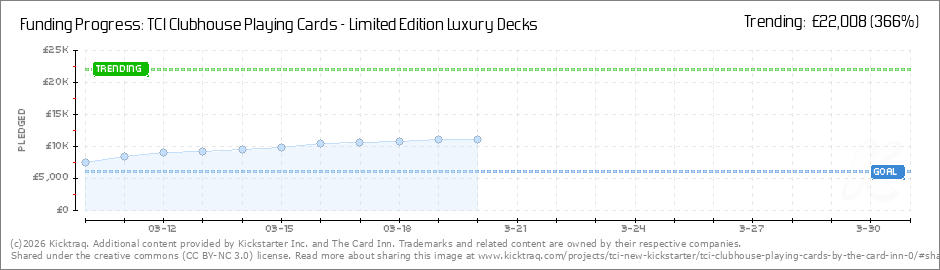 Hello! We are a little over 48 hours from TCI Clubhouse Playing Cards going live on Kickstarter! Currently we have 236 people signed up to this campaign and we have a total of 56 decks available at Early Bird pricing. That's 16 gilded decks and 40... (Read More)