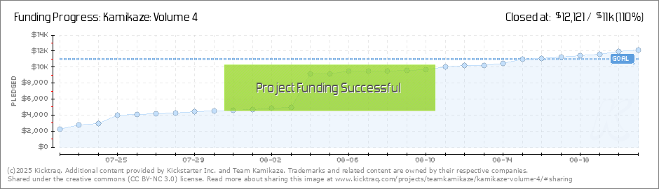It's official, the Kamikaze Vol. 4 graphic novel will be coming to print thanks to you! We just crossed the $11,000 pledged threshold with 6 days left on the clock. Thank you so much to all of you who have backed the campaign and spread the word.... (Read More)