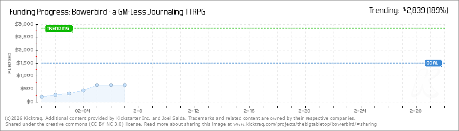 Help your backers reach your daily goals and help others see how you're doing. It's easy, with Kicktraq Mini.Here are a few quick snippits of code you can use to embed your personalized widget on your website, in your blog, and even on your favorite forum.