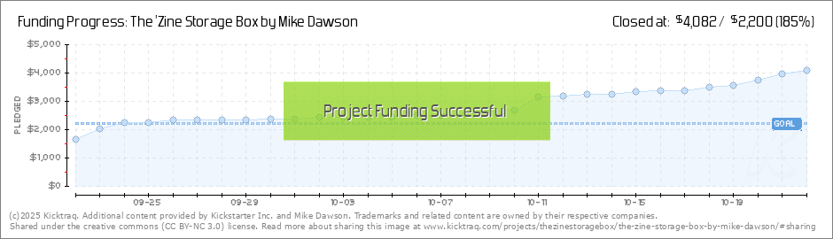 Great news, as of yesterday afternoon, the 'Zine Storage Box met it's funding goal, which means I will be moving forward producing these projects! I am so excited. Thank-you to all of you for your generous support, I can't express how much I... (Read More)