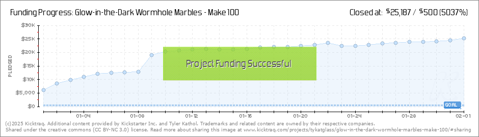 Hi Backers! I want to thank you all for the incredible support for this years Glow-in-the-Dark Wormhole Marble Make 100 project. The project was fully funded within minutes of launching and that is incredible! I recognize a bunch of names from my... (Read More)