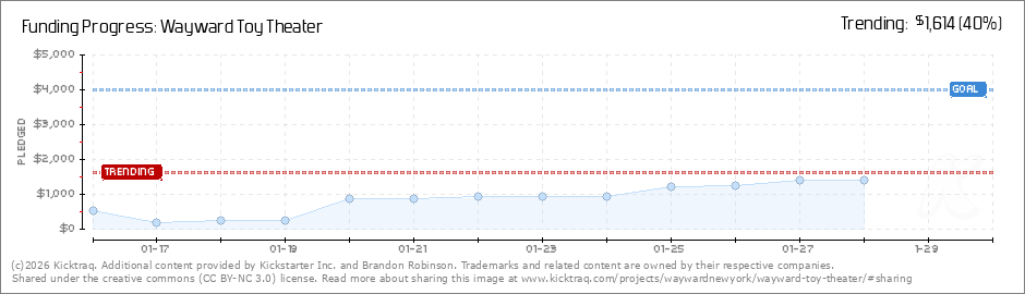 Help your backers reach your daily goals and help others see how you're doing. It's easy, with Kicktraq Mini.Here are a few quick snippits of code you can use to embed your personalized widget on your website, in your blog, and even on your favorite forum.