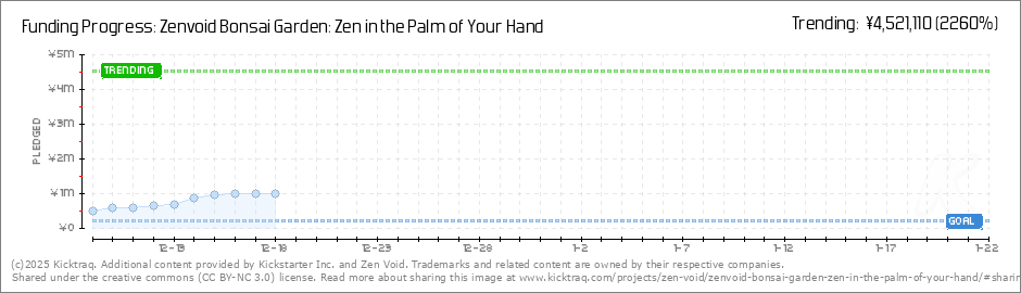 Hello everyone, We are very happy to share that the ZenVoid Bonsai Garden has officially reached its funding goal. Currently we've raised 571,350 yen, and which was made possible entirely thanks to your support! Your enthusiasm for this tiny world of... (Read More)