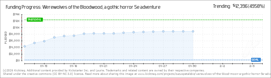 Help your backers reach your daily goals and help others see how you're doing. It's easy, with Kicktraq Mini.Here are a few quick snippits of code you can use to embed your personalized widget on your website, in your blog, and even on your favorite forum.