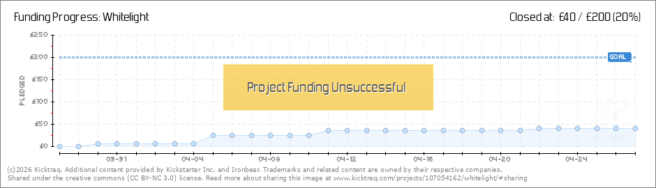 Good evening ladies and gents. I just wanted to post a quick update and say thank you for taking interest and supporting Whitelight's Kickstarter! Unfortunately it doesn't look I'm going to reach the goal within the next 24 hours so with that said... (Read More)