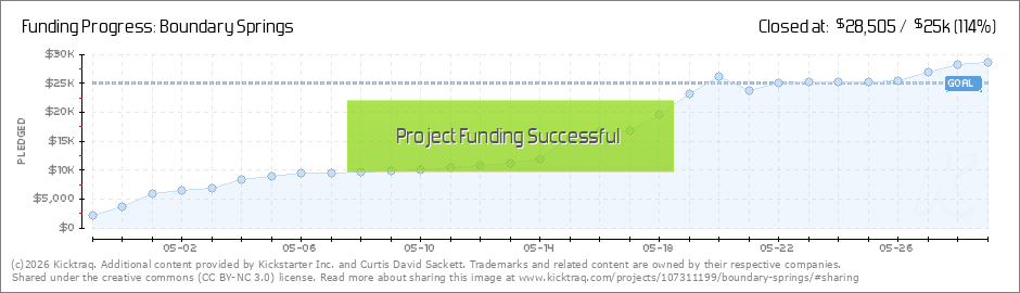 You'll need an HTML5 capable browser to see this content. Play 00:00 00:00 Thanks for getting us to 50%. We need your help getting to 100%!! Please tell 2-3 people about why you donated to Boundary Springs. What is it about this project that... (Read More)