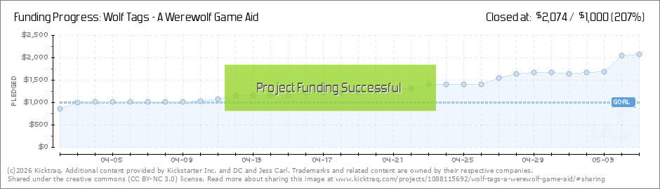 This is the final week for the Wolf Tags Kickstarter project. After the funding closes, you can expect to see the project polls for the pledge manager system via email fairly quickly. If there's anyone you know who you think would like to join in,... (Read More)