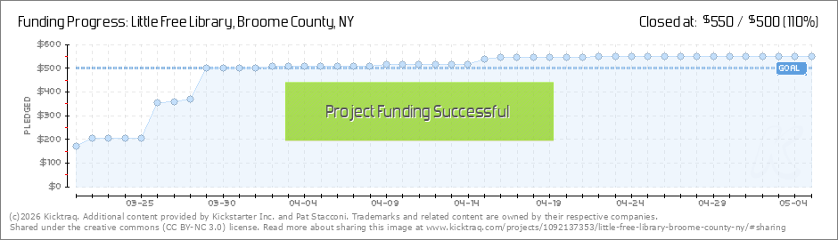 YAY!!! As of today, March 30th, we have reached our $500 pledge goal!!! Thank you to everyone who helped us get this far. We truly appreciate your support. This will allow us to establish our first three Little Free Libraries...one in Endwell, one... (Read More)