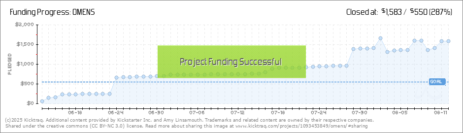 Omens backers!!!! I CANNOT CONTAIN MY EXCITEMENT!!!!! WE ARE FUNDED!!!!!!!!! Thank you so, so, so, so, so much for everything! You all have our eternal gratitude!!!! LDKFJALSKDFJLAKSDJFLAKSDJFLKDJSFLKDJFG!!!!!!!! Yes, I started to keyboard mash... (Read More)