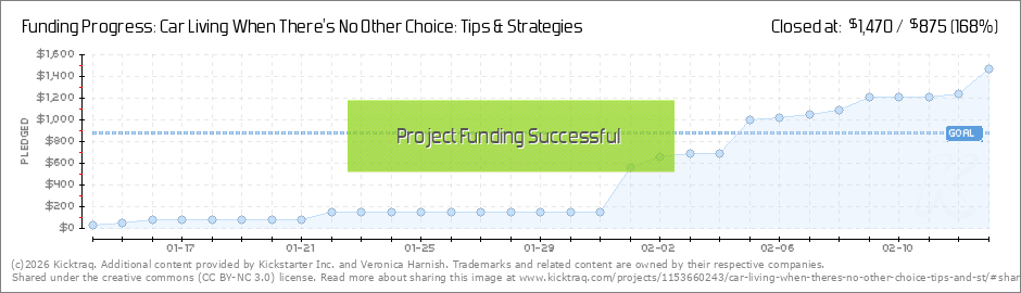 I'm 78% of the way there with 8 days to go. Homelessness and car living is not a "sexy" project like most of the fun things on Kickstarter, so I am extremely grateful to everyone for their support. I am amazed I am even this close! In case you... (Read More)