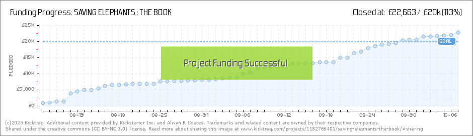 112% funded!!! Hi everyone, I can't thank you all enough for your support and pledges during this Saving Elephants Kickstarter campaign. it is now 112% funded and is closed in around 84 minutes to go as I type this Update. 84 mins left on saving... (Read More)