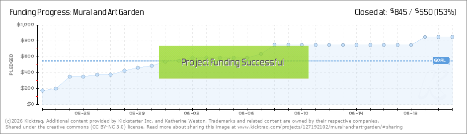 The Mural/Art Garden project is over the 50% mark! Thank you to all who have contributed so far. Once the project is funded, I will be documenting progress: from snapping chalk lines for the grid on the wall all the way to the last brush stroke... (Read More)