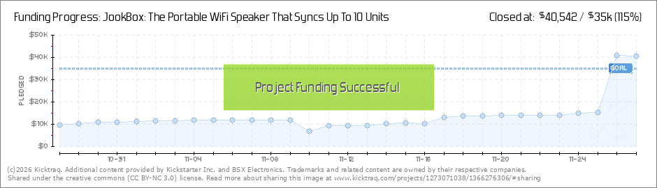 Thanks Kickstarters for getting us 1/3 of the way to our $35K goal. We’re really pumped by the positive response we have received and are continuing to work on making JookBox the best portable speaker on the market today. Please help us to get to... (Read More)