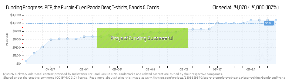 Good Morning PANDA ON! Backers!! Thank you so much for your support of this project. It means the world to Eric and me for you to join us on our PANDA ON! Journey! With your help, love and support, we are 67% funded at $ 668.00 (YAY!!) with 22 days... (Read More)