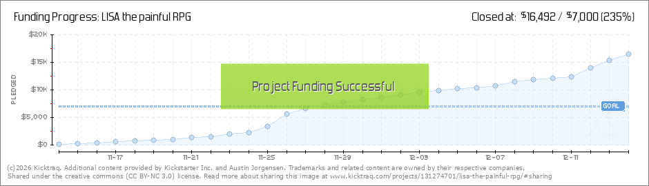 Look at this, look at this! Destructoid's Jon Holmes has done a write up! http://www.destructoid.com/lisa-is-a-men-only-apocalyptic-horror-comedy-2d-rpg-266355.phtml Let's hope this can boost things up a bit! Also, thank you to all new backers! (Read More)