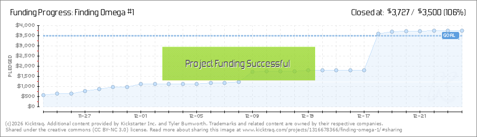 Thank you everyone for your generous pledges! As I'm writing this, we have officially hit $1,750! For those of you keeping track, that's exactly 50% of our funding goal. A special thank you to Kelly Burnworth and Randy Carrasco for their pledges! As... (Read More)