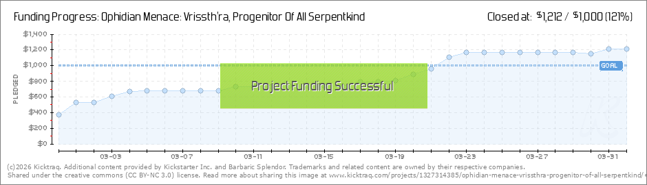 The campaign will end at midnight Pacific time on Monday, March 31. I am happy we have funded Vrissth'ra, and will be back with more Ophidian Menace soon, including the miniatures not funded here. Here is a sneak-peek at some unseen lore to go along... (Read More)