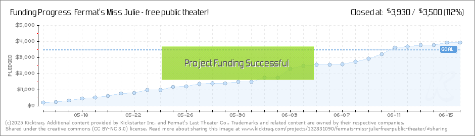 Miss Julie - a lot can happen in one night We've got six days left on our Kickstarter - 49 donors have gotten us close to our goal of $3500. Please tell your friends and family to join you in supporting free public theater - we need $765 to get... (Read More)