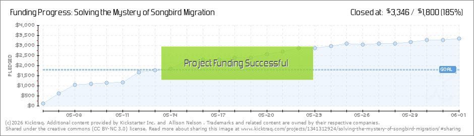 Hello everyone, I just wanted to send you all a huge thank you for helping me reach my minimum goal of $1800. I am so impressed with the generosity and support of all of you, my backers. I now have enough funds to purchase about 18 geolocators. Any... (Read More)