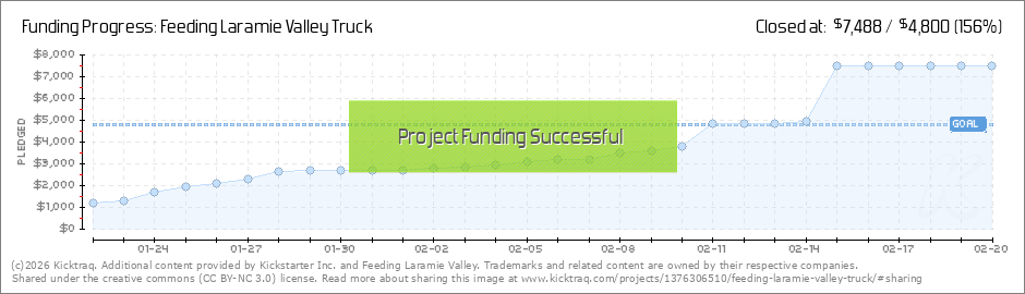 Our Kickstarter project for the Feeding Laramie Valley Truck is off to a thrilling start! Just one week in, and we have 34 backers for total pledges of $2283. That gives us 23 more days to raise the remaining $2517 and reach our goal. So far, the... (Read More)