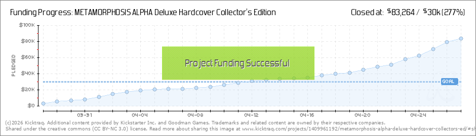 Hi everyone, With funding just around the corner, it's time to update the stretch goals! As a reminder, every copy of the Metamorphosis Alpha hardcover will include two freebies. First, a PDF of the WardCo edition of the 1E Metamorphosis Alpha.... (Read More)