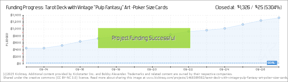 Hello, Thanks for backing the "Pulp Fantasy" poker size tarot deck it will take two weeks for payments to clear , please fill out the survey that's how I will receive your address , thanks Bobby (Read More)