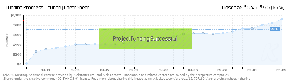 By the numbers, we are 38% into the campaign with 59% of the goal complete! Kicktraq.com has us trending towards $1055. Over the next week, I will update you with the specifics of what will be on the Laundry Cheat Sheet. You, the crowd, will be... (Read More)