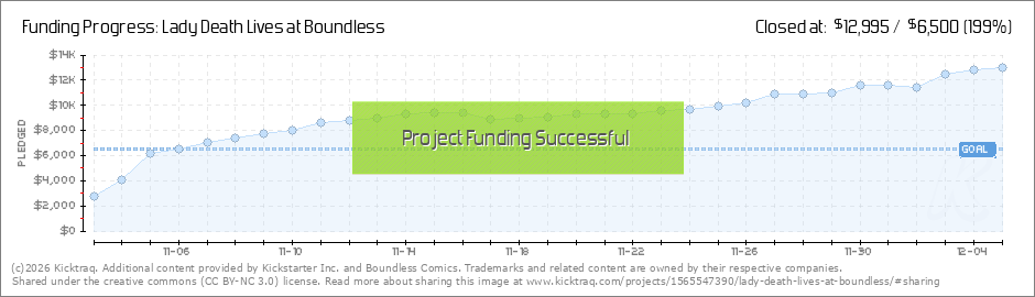 Thanks for helping us hit our goal, it is truly appreciated! Due to popular demand, we've added a Stretch Goal with a very cool bonus. If we hit a Stretch Goal of $15,000, everyone at the $25+ level receives free Digital copies of Medieval Lady Death... (Read More)