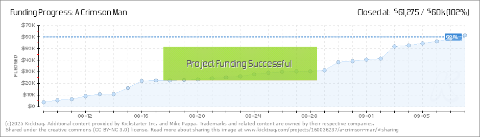 A CRIMSON MAN has been added to KICKSTARTER'S A PROJECT WE LOVE! "Congratulations! We’re huge fans of your project and it’s now being featured as a Project We Love on Kickstarter. Don’t worry about creating any badges or banners (seriously),... (Read More)