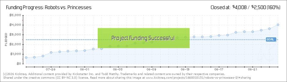 We did it! As of tonight, Robots vs. Princesses is funded and it's all thanks to you, so thank you. Is the campaign over? No way! We still have 13 days left and plenty of stretch goals to unlock, so don't cancel your pledges. There's a lot more fun... (Read More)