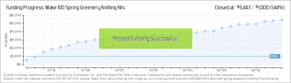 Thanks to all of you, we made our goal of $1000 in 3 days! The Greenery Kits are a-go. We are setting a new stretch goal of $3000. If we reach that goal, we are going to produce special edition Greenery Steel City Fiber Collective project bags.... (Read More)