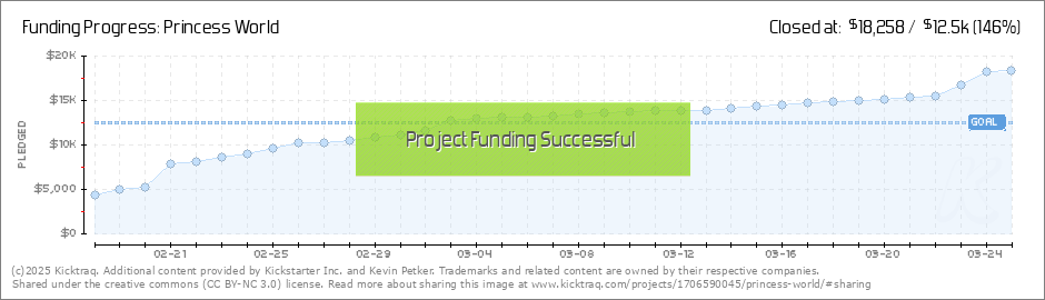 Thank you all again for getting Princess World over our funding goal! By surpassing that milestone, we are pleased to reveal some stretch goals! Stretch Goal #1 - More Art will unlock at $15,000 Stretch Goal #2 - The Dark Princesses will unlock at... (Read More)