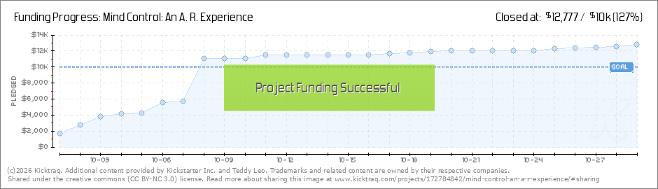 Wow! We are halfway to our primary goal. Together, we can continue to build the Mind Control Universe. Do not stop now, continue to share, talk about, and donate to Mind Control: An A.R. Experience! (Read More)