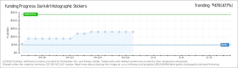 Help your backers reach your daily goals and help others see how you're doing. It's easy, with Kicktraq Mini.Here are a few quick snippits of code you can use to embed your personalized widget on your website, in your blog, and even on your favorite forum.