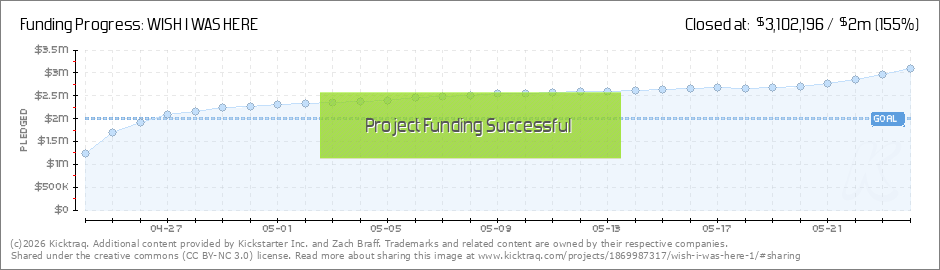 Zach Braff raised over $1.5 million on Kickstarter in one day to fund his new movie, Wish I Was Here. As of this afternoon, the film has over 21,700 backers and is less than $500,000 away from reaching its $2 million goal; it will serve as the follow-up to his 2004 directorial debut, Garden State. (Read More)
