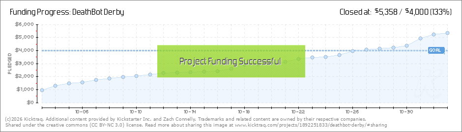 WOOHOO! It finally happened. We have funded! With 5 days to go and an upcoming convention, DeathBot Derby is well on its way to unlocking some awesome strech goals. We have already unlocked the social goal and James has been working around the clock... (Read More)