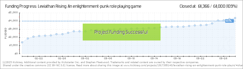 So, with our last backer we just ticked over to 75% backed, with 20 days to go. Thanks everyone for the support! In the upcoming week I will be: 1) doing the promised update on the magic system. 2) starting an actual play session which will be going... (Read More)
