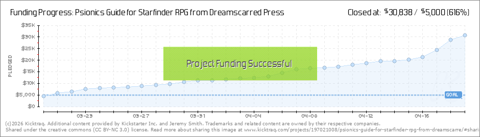 What a day! Welcome to all our new backers! We have reached over 350 backers and over $14,000 in funding, so we are adding the Athanatism psionic discipline and the Familiar Strangers motif to the Psionics Guide! Athanatism, if you are not familiar... (Read More)
