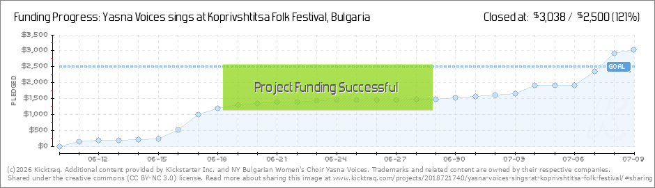 Dear friends and supporters - We at Yasna Voices are so touched by your generous support, and can't wait to take you on a music and life, week-long journey to Bulgaria in August! The campaign reached it's goal, and together we've raised 116% WOW :)... (Read More)