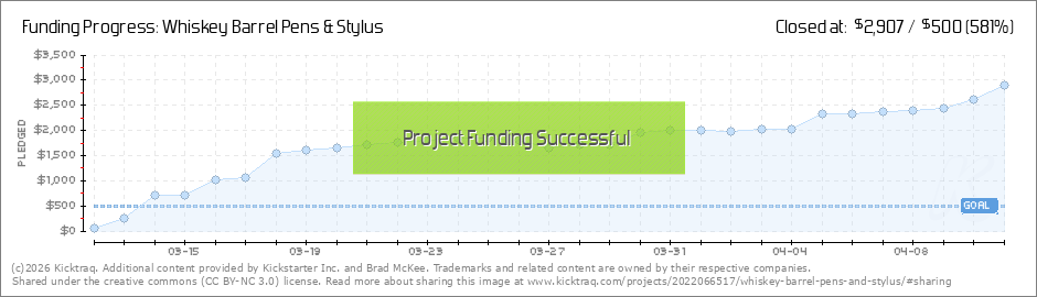 Hello KickStarter, Only 9 days left to Back my Whiskey Barrel Pen and Stylus Project!!! I am currently trying to make my stretch goal of $2500. Currently, I have achieved my $1500 goal, so I will be upgrading the pen and stylus cases. Thank you... (Read More)