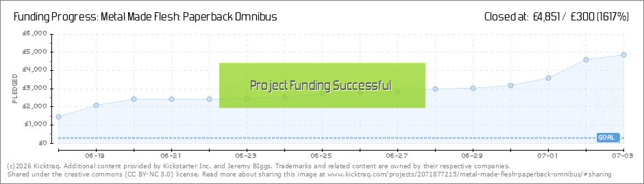 WOOHOO! We did it! A huge, HUGE thank you from Sim, myself and the rest of the Metal Made Flesh team for your help in making the paperback omnibus a reality. What happens next? Over the next 10 working days Kickstarter will begin collecting... (Read More)