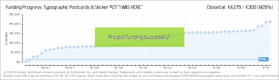 Dear Backer, I just wanted to let you all know that the campaign reached Stretchgoal 5 (in just one day!) ▶ all backers will receive 5 extra "I WAS HERE" Postcard Stickers! Currently rewards will be send out to 138 Backers from 25 countries:... (Read More)