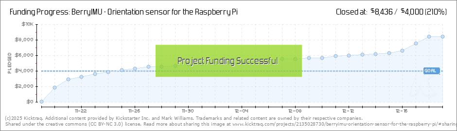 Thank you for supporting BerryIMU. We are 80% of the way to our goal and still 25 days to go. Please help spread the word! We aim to take the difficulty out of using these sensors and make them a lot more enjoyable to use. We will have ready to use... (Read More)