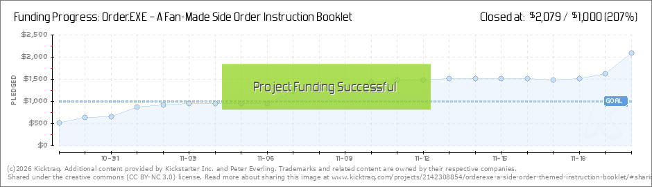 Hi, backers! I'm writing this first update to let you all know that Order.EXE has reached it's funding goal a few days ago! It's sort of a belated celebration, but booyah all the same! That means this booklet is going to be printed and sent out to... (Read More)