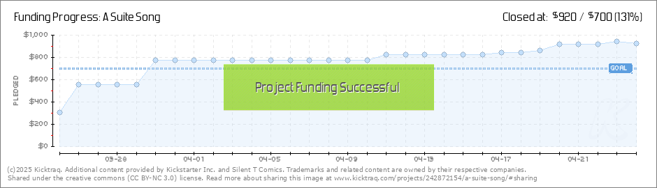 Hello everyone! “A Suite Song” has a new stretch goal set for $1200 If we can reach this goal; FOUR additional pages will be added to the comic book! These four pages will include never before seen sketches, and a tease of what is in store for... (Read More)