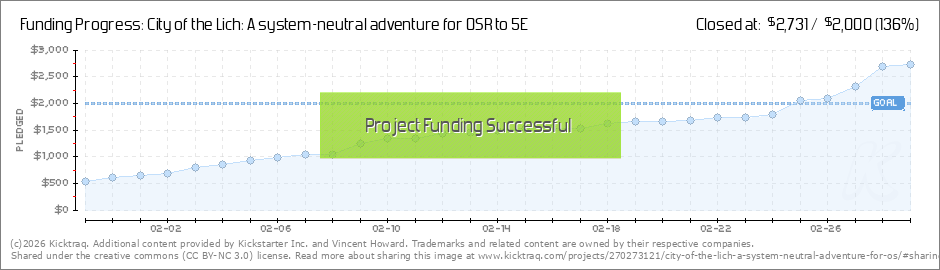 My thanks to Owlglass for bringing us right on top of our Stretch Goal, and Paul F. for putting over 100 Backers! My thanks as well to each and every one of you whose backing made City of the Lich a done deal, this couldn't have happened without... (Read More)